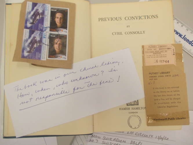Due back on 16 October 1964, the novel ‘Previous Convictions’ by Cyril Connolly was returned with a handwritten note from a Mr Johnson from Athens, who wrote: “This book was in our church library. I’m not responsible for the fine!”