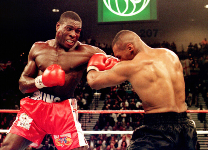 Pictured top: Frank Bruno battles with Mike Tyson in defence of his heavyweight title in 1996 (Picture: PA)