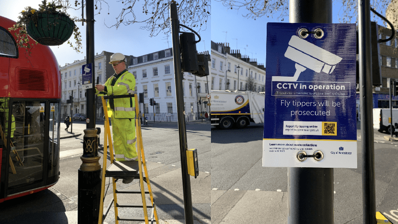 Pictured top: Westminster City council has put up CCTV to catch fly-tippers and it is using AI to alert officers when offences happen (Picture: Westminster City council)