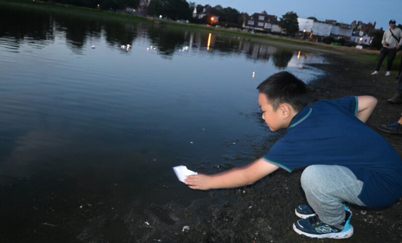 This year, the origami boats prepared before the ceremony under Gill McCall’s instruction, floated tea lights with batteries as candles are no longer permitted.