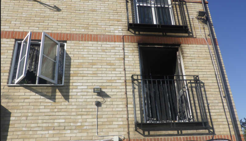 The fire damaged part of a flat on the first floor of the building. One woman, suffering from smoke inhalation, was led to safety before the Brigade arrived and was treated at the scene by London Ambulance Service crews.