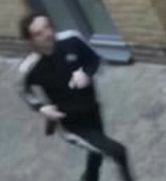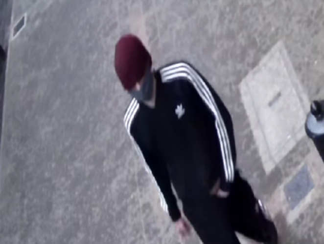 The suspect is described as a white man with brown ear-length hair in curtains, wearing a black Adidas tracksuit with white stripes along the arms and legs.