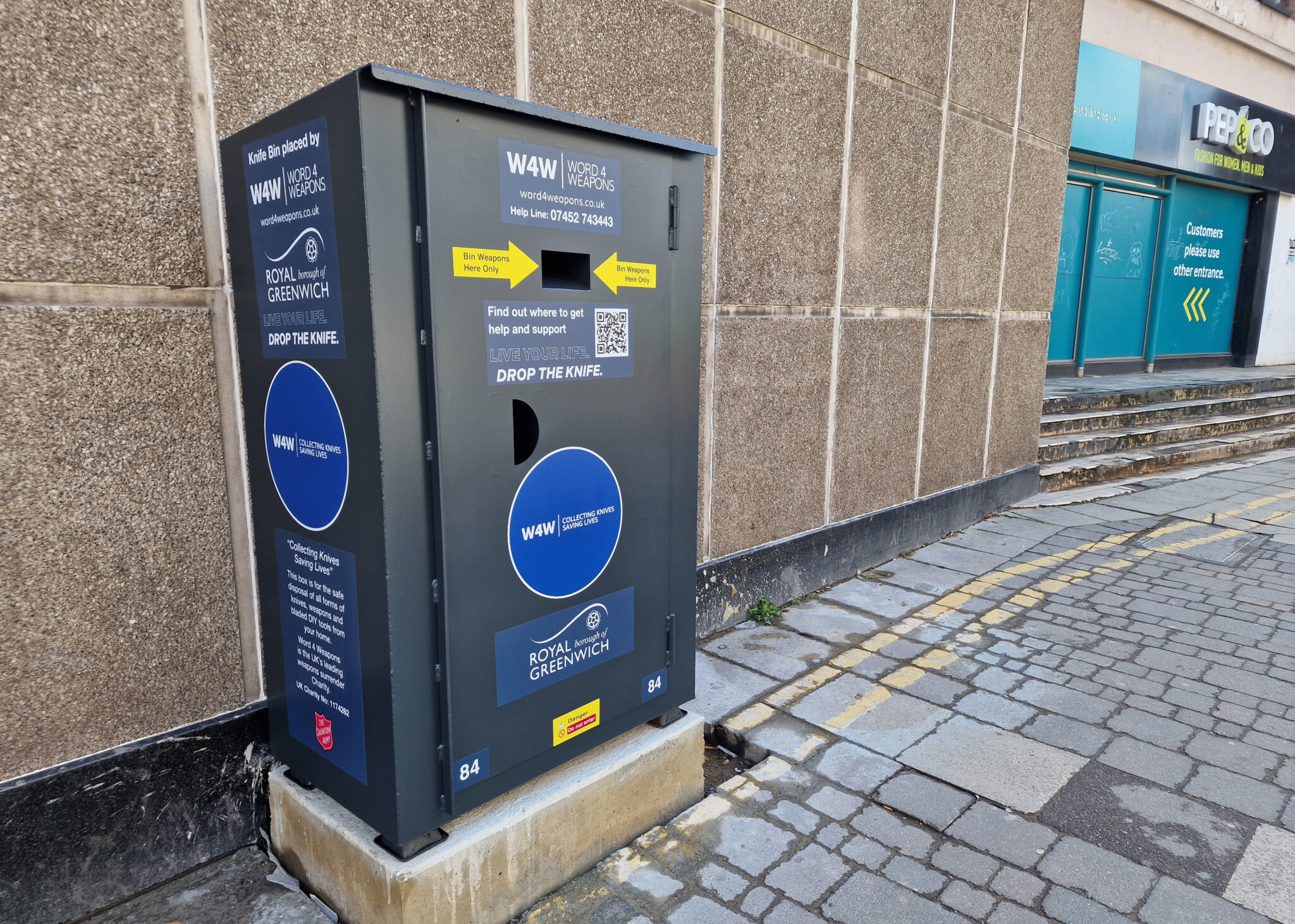 The new addition to Woolwich town centre, in Calderwood Street at the junction with Powis Street, brings the number of knife bins in the area up to three, as Greenwich council attempts to tackle knife crime.