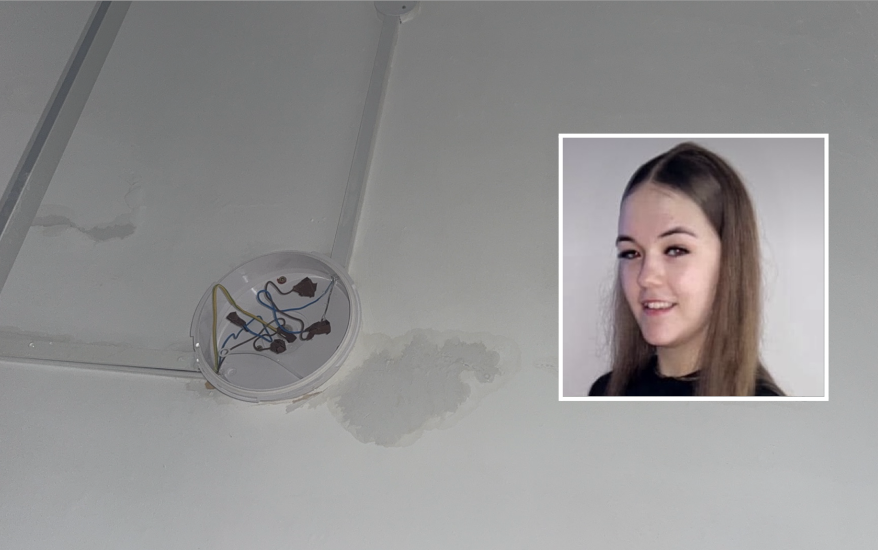 Pictured top: The lighting in Sophie Nolan’s flat has been dismantled for safety due to the leak, Sophie Nolan (Picture: Sophie Nolan)