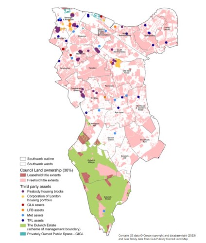 Over a third [36 per cent] of land in the borough is owned or controlled by the council, with other public organisations such as Transport for London [TfL], the NHS, the Met Police and the London Fire Brigade [LFB] also owning large amounts of land in Southwark.