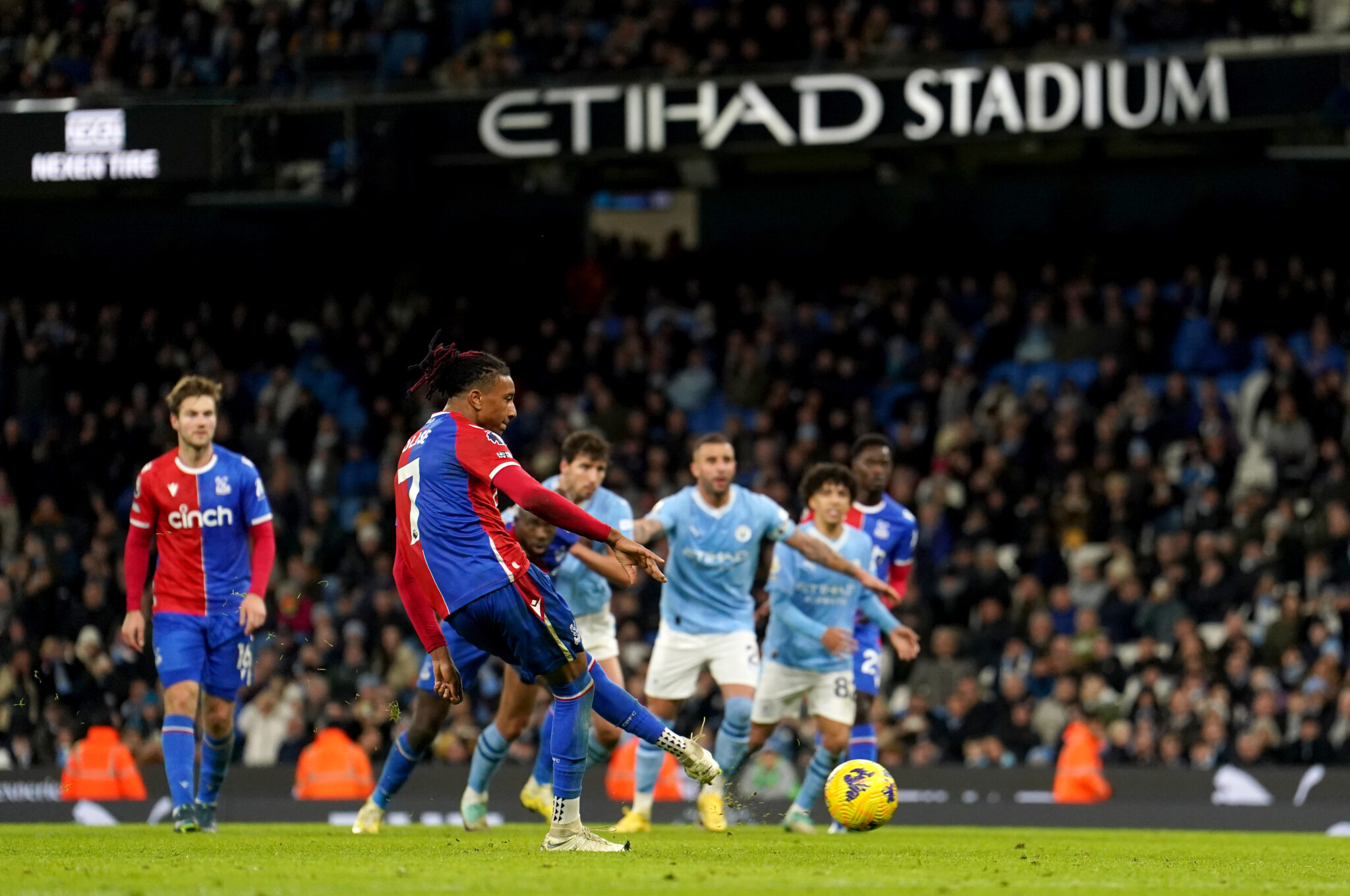 Crystal Palace’s Michael Olise celebrates scoring his sides second goal from the penalty spot during the Premier League match at the Etihad Stadium, Manchester. Picture date: Saturday December 16, 2023.