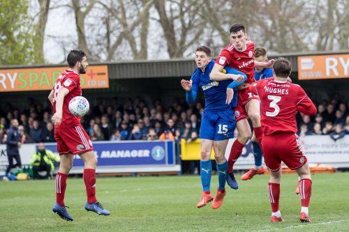The Dons made a fast start, with visiting keeper Dimitar Evtimov forced into action inside the opening five minutes, a low drive from Toby Sibbick from the edge of the area beaten away by the Accrington keeper, before Scott Wagstaff couldn’t re-arrange his feet to convert an excellent chance from close-range.