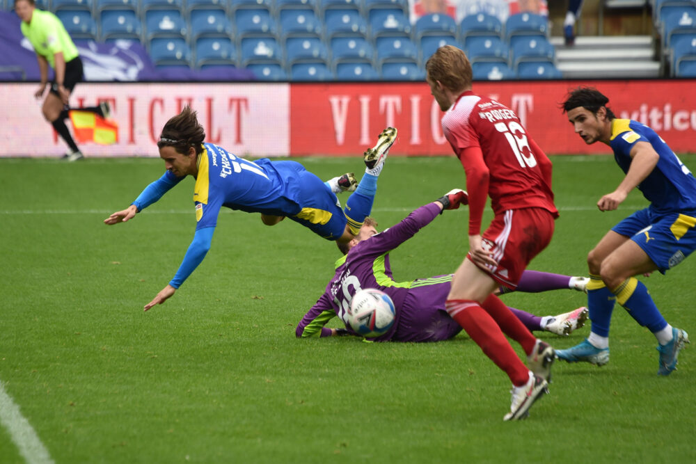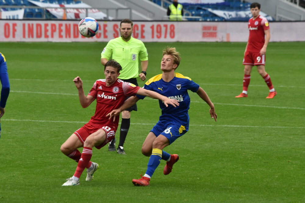 After Toby Savin rushed off his line to deny substitute Ethan Chislett, the Dons came close to levelling the scores 10 minutes from time when Shane McLoughlin’s powerful strike smashed the post. Longman put the rebound wide.