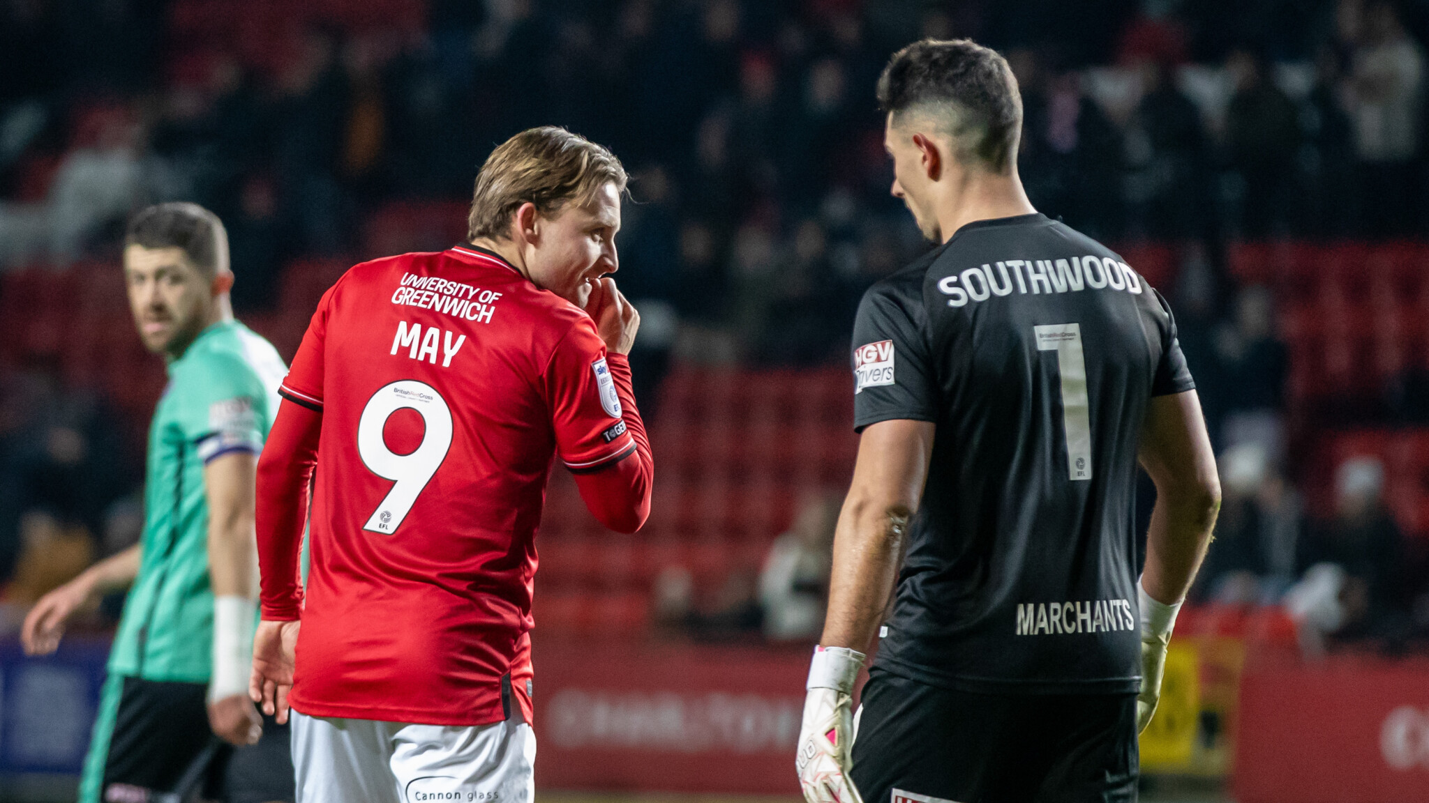 May could be seen talking to Robins goalkeeper Luke Southwood after scoring his first of the evening.
