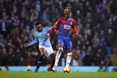 Crystal Palace’s Wilfried Zaha holds off Manchester City’s Raheem Sterling during the Premier League match at the Etihad Stadium, Manchester. PRESS ASSOCIATION Photo.