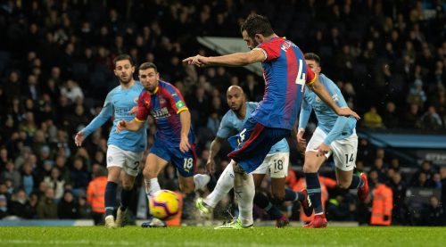 Crystal Palace’s Luka Milivojevic scores from the penalty spot against Manchester City
