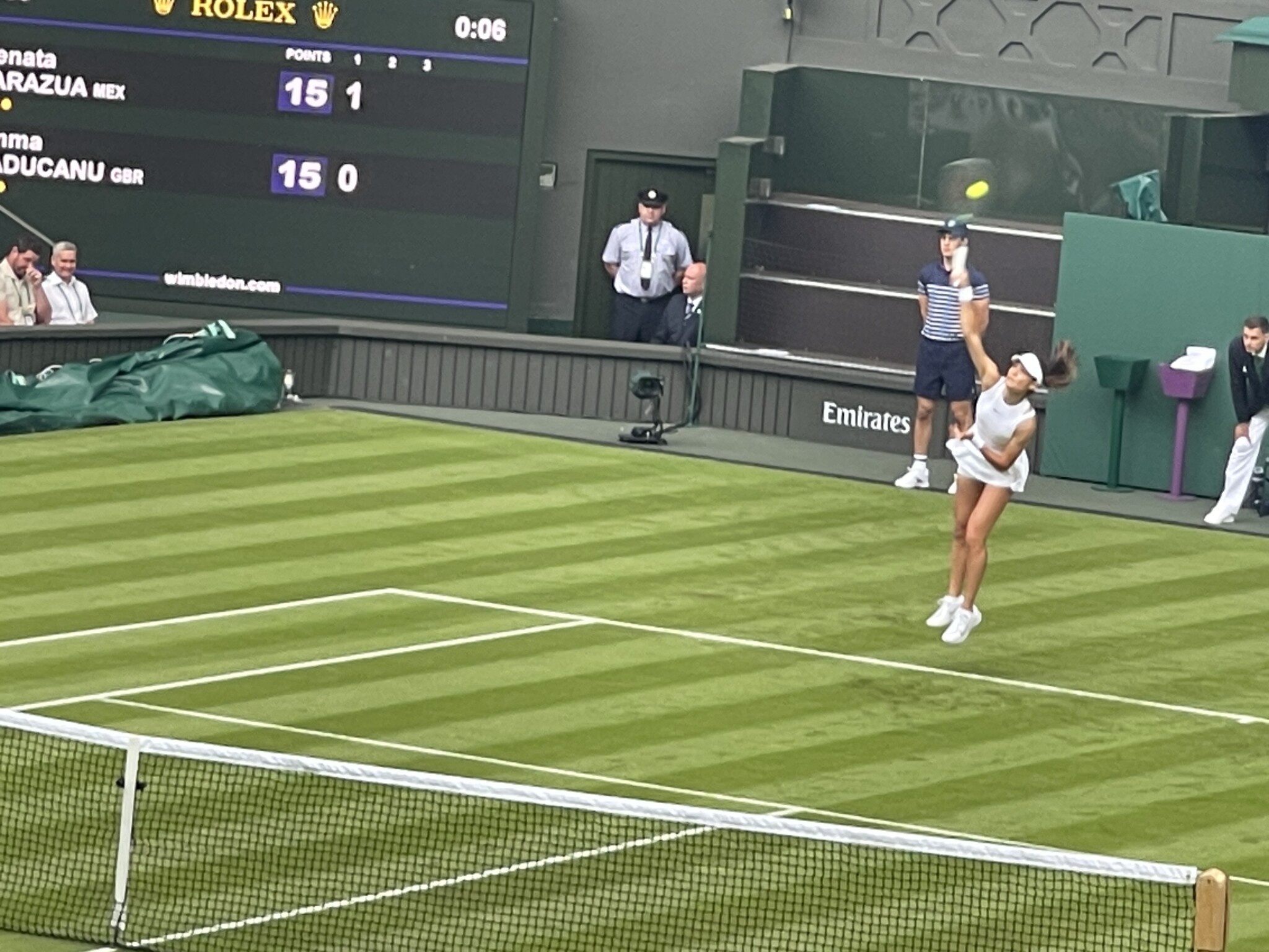 A mini break cheered the Raducanu fans in the crowd. A powerful serve made it 2-0, quickly followed by another net by Zarazua to make it 3-0. Then a powerful forehand down the line saw her opponent hit long, another long shot by the Mexican followd which made it 5-0 on Raducanu’s serves. And then it was 6-0 and set point.