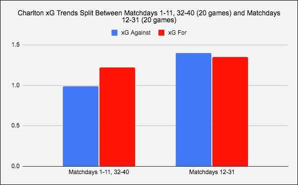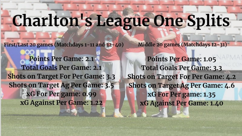 In this 20-game run — stretching from November 24 all the way until the awful 3–0 loss to Blackpool on February 27— Charlton’s matches yielded an average of 3.3 goals per game.