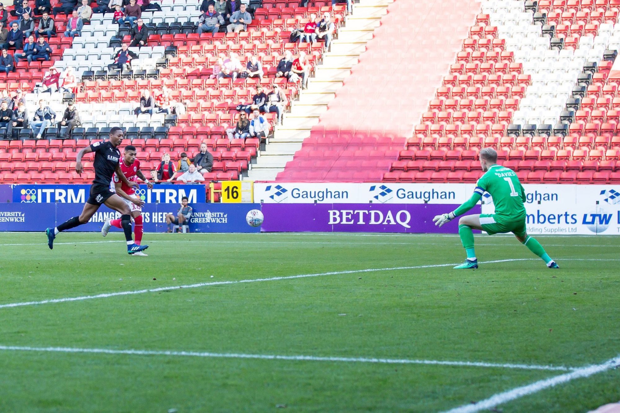 The stopper was called into action again soon after as Taylor’s superb pass sent Grant on his way. Davies stormed off his line to clear the ball, with Taylor then returning it with interest with the goalkeeper out of his goal, only for it to be headed clear when it looked to be going in.