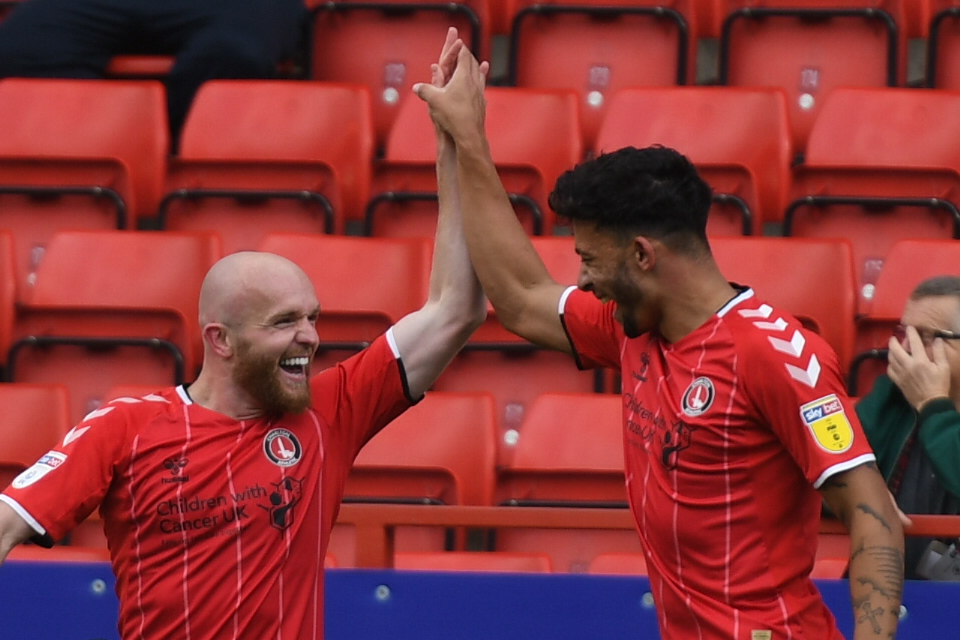 Jonny Williams and Macauley Bonne celebrate Charlton’s opener against Derby. Kyle Andrews