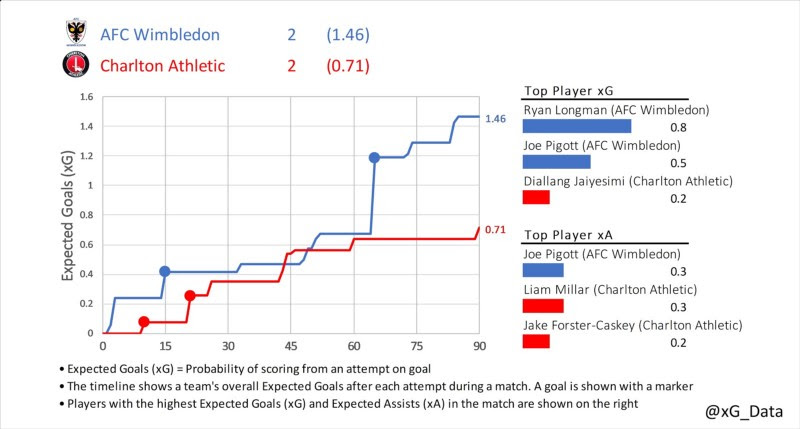 Charlton did have a chance to win it in the dying moments, Chuks Aneke smashing the post from a tight angle, but it would have been extremely harsh on Wimbledon. Expected goals (xG), used to measure the quality of each team’s chances, tells the story of the game.