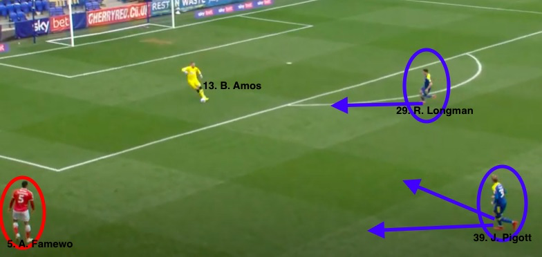 At this point, Famewo could either pump the ball long or play it back to his keeper. Either way, Charlton are in no position to play short passes out from the back and it must get launched forward. Maybe Amos would have gone long next, but we’ll never know because Famewo’s ball didn’t reach him.
