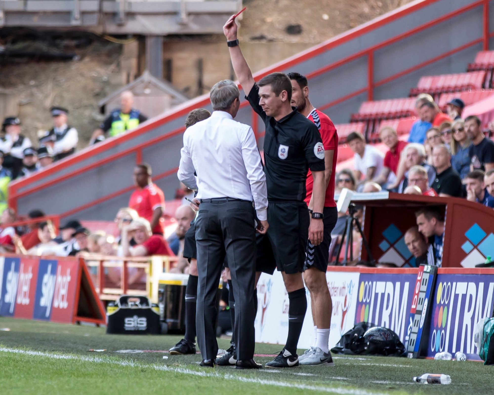 The Addicks boss got his marching orders towards the end of the Championship match from referee Matt Donohue.