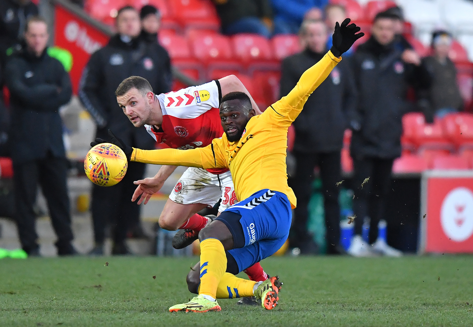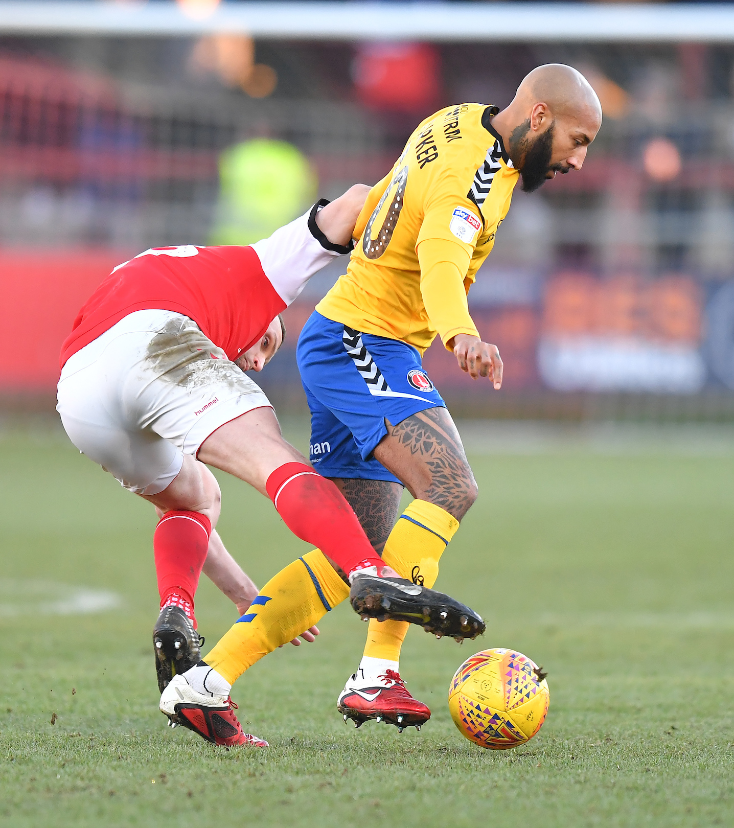 Charlton Athletic’s Igor Vetokele (right) battles with Fleetwood Town’s James Wallace