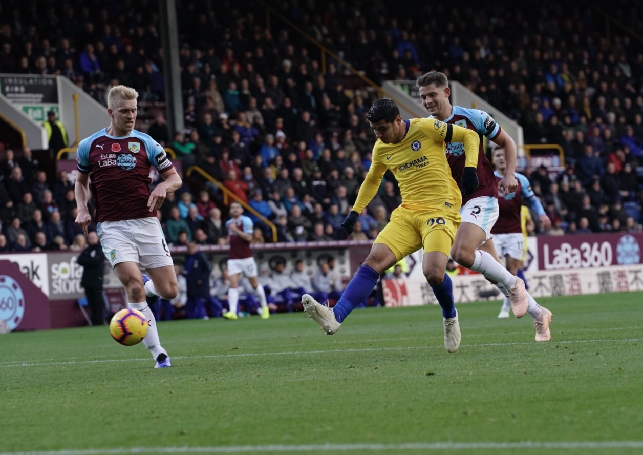 Alvaro Morata scores the opener in a 4-0 win at Turf Moor Photo: Sean Gosling