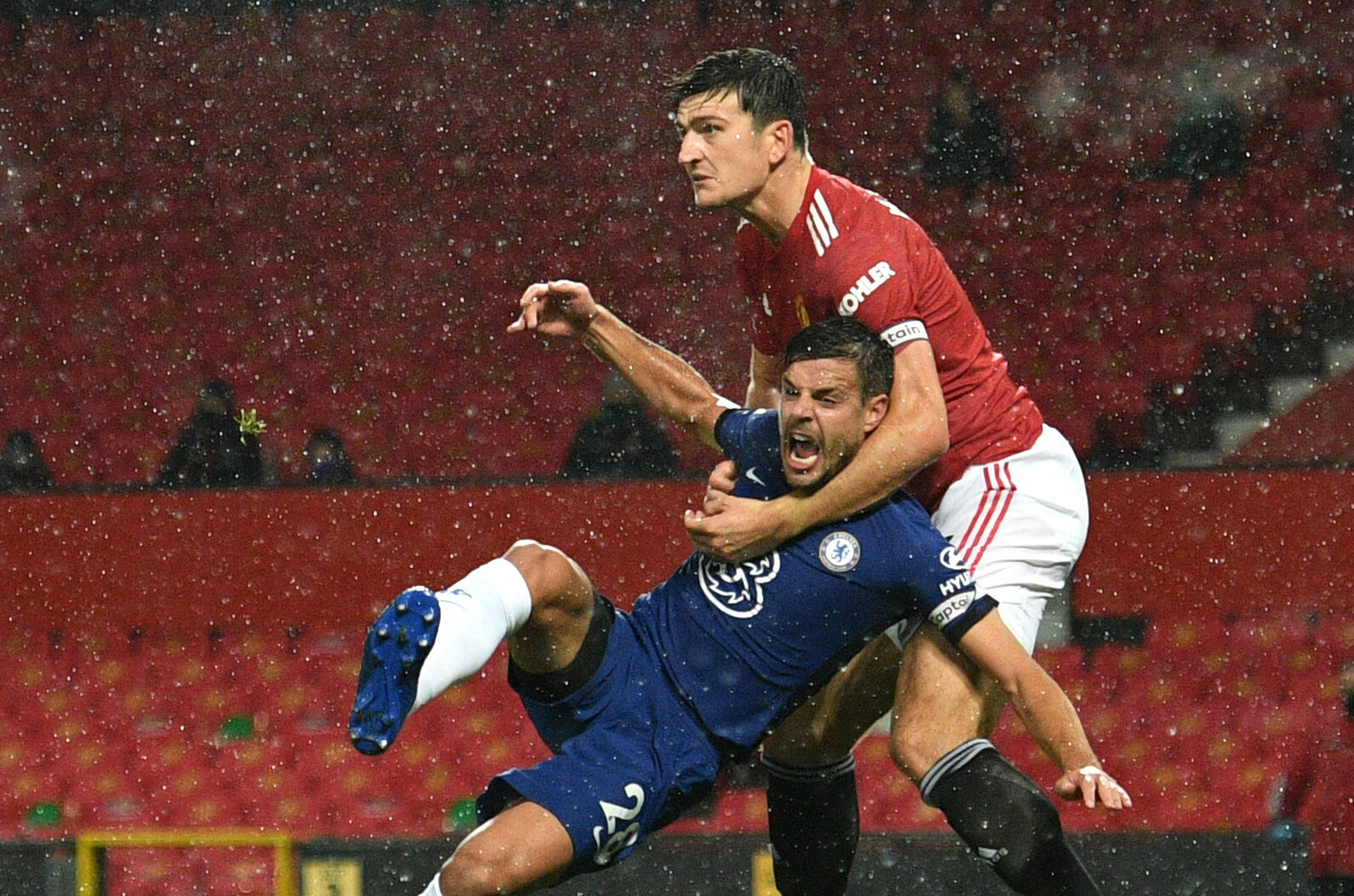 The Blues should have had a penalty after United centre-back Harry Maguire wrapped his arms around Cesar Azpilicueta’s neck in the penalty area.