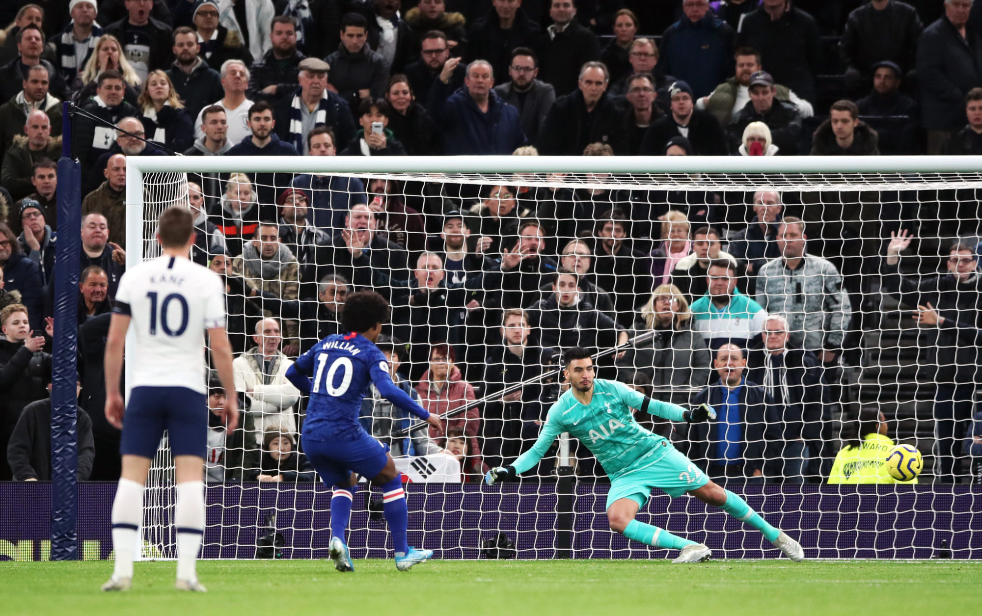 Chelsea’s Willian scores his side’s second goal of the game from the penalty spot during the Premier League match at Tottenham Hotspur Stadium, London.