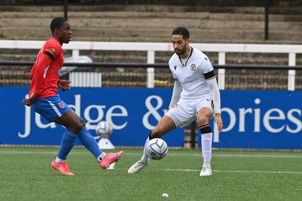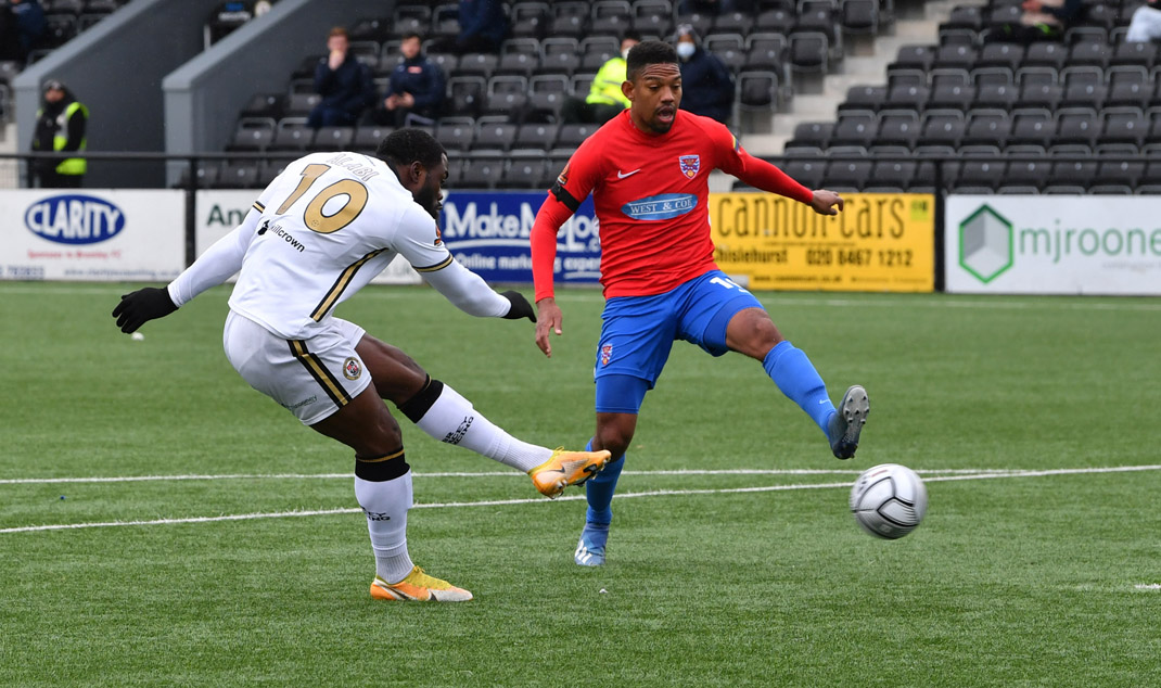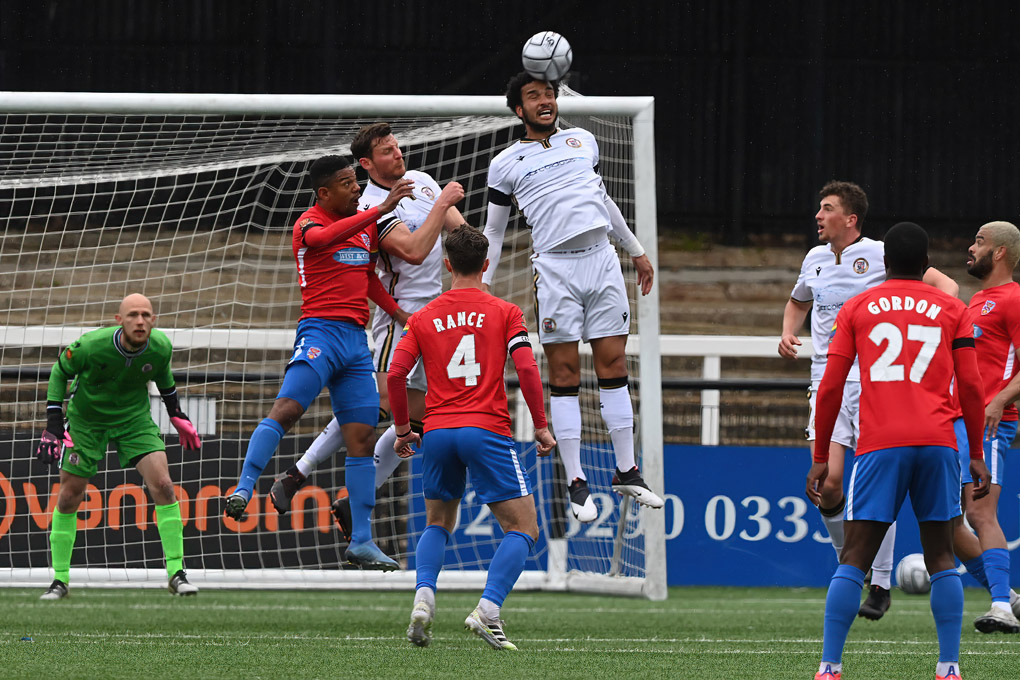 After that, the visitors gave Bromley a testing 25 minutes. Paul McCallum’s header was deflected just wide by Bush then Jack Holland made a brilliant defensive headed interception when McCallum was hoping to get on the end of George Saunders’ cross.