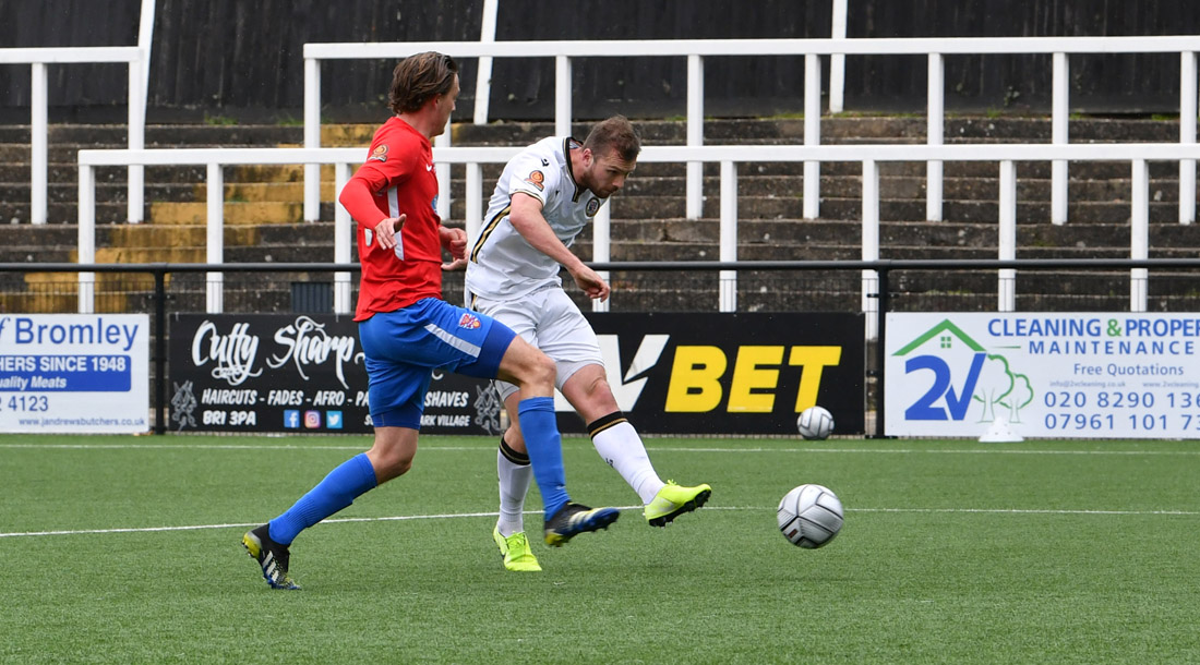 After that, the visitors gave Bromley a testing 25 minutes. Paul McCallum’s header was deflected just wide by Bush then Jack Holland made a brilliant defensive headed interception when McCallum was hoping to get on the end of George Saunders’ cross.