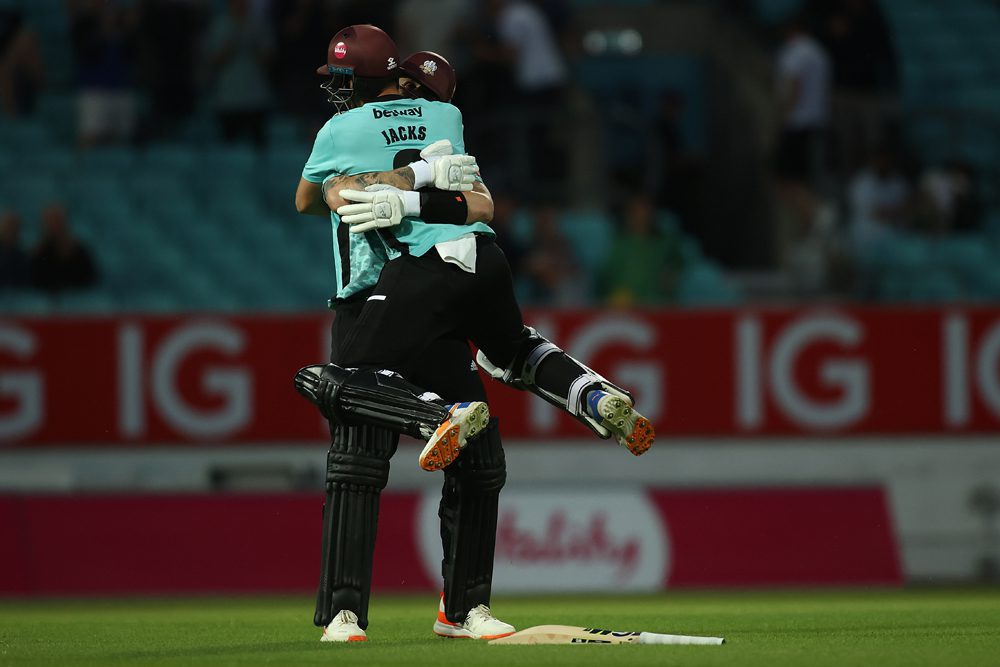 Conor McKerr and Will Jacks celebrate victory following the Vitality T20 Blast match between Surrey and Somerset at The Kia Oval on June 21, 2022 (Photo by Ben Hoskins/Getty Images for Surrey CCC)