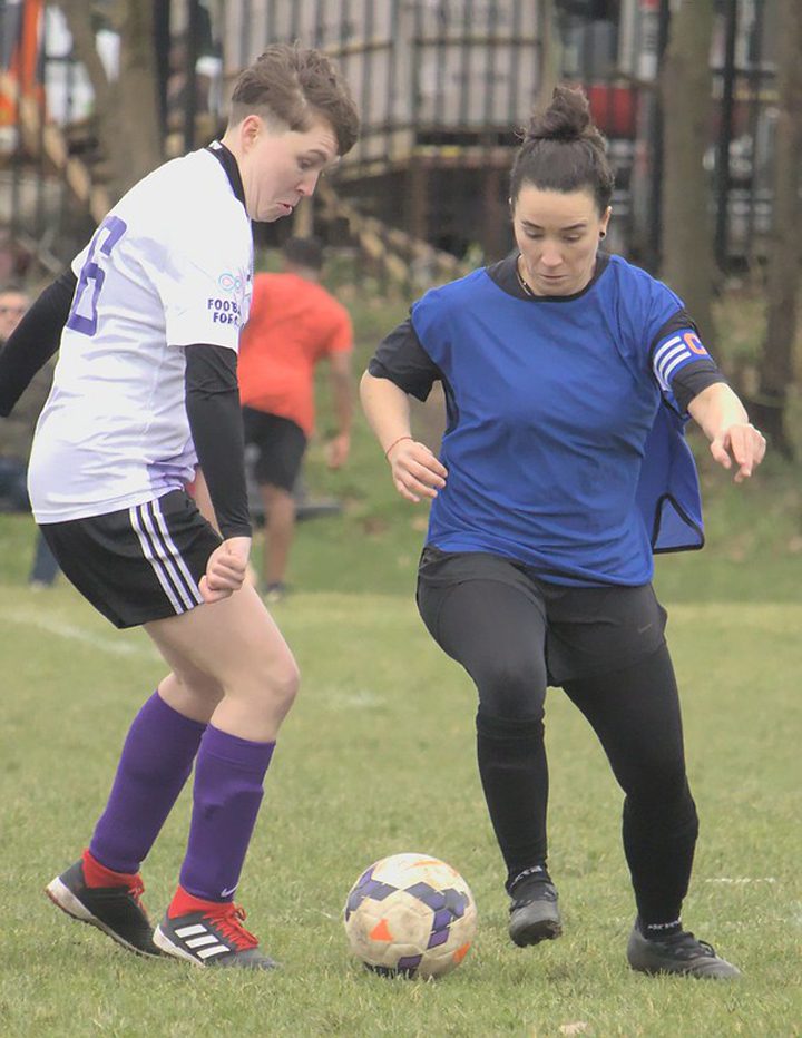 Another attack by Queerspace created one of the most bizarre goals ever. The ball bounced on the edge of Croydon’s half, and Croydon’s Daniella De Croix whacked it up and away from her area. The ball was caught the wind, sailed over the halfway line, and bounced in front of the Queerspace keeper, who misjudged the ball. Despite swiping away at the ball, the keeper was left red-faced as it crept into the net. 2-1 Croydon.