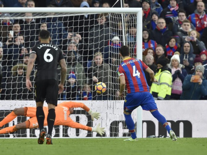 The Serbian’s spot-kick was parried by Karl Darlow into the bottom corner after Palace had trailed following Mohamed Diame’s 22nd-minute goal following calamitous set-piece defending by the Eagles.