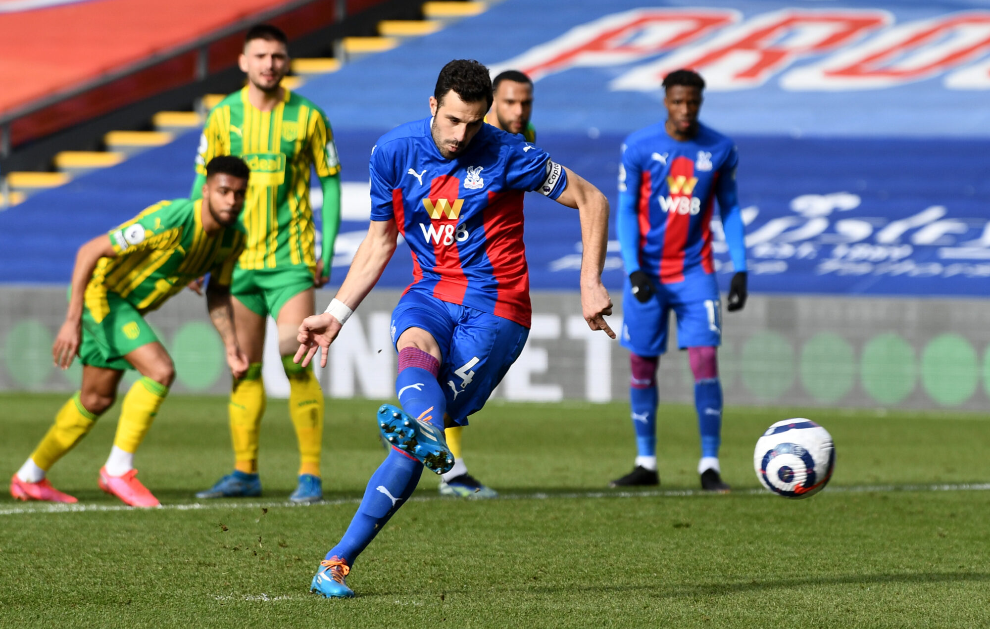 Palace took the lead eight minutes before half-time. Zaha found space on the edge of the penalty area to clip a cross into the box, but it appeared to be diverted away by the arm of Furlong. Referee Simon Hooper did not initially award a penalty but eventually did so after reviewing the footage on his pitchside monitor.