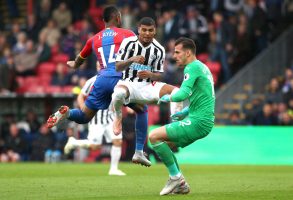 Newcastle United goalkeeper Martin Dubravka (right) clashes with DeAndre Yedlin (centre) and Crystal Palace’s Jordan Ayew during the Premier League match at Selhurst Park, London. PRESS ASSOCIATION Photo.