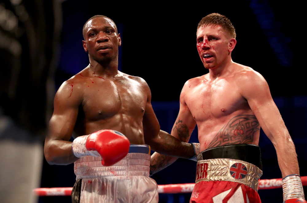 Andre Sterling (left) celebrates victory over Ricky Summers as the two hug at the end of the Eliminator for British Light Heavyweight Championship match at the O2 Arena, London.
