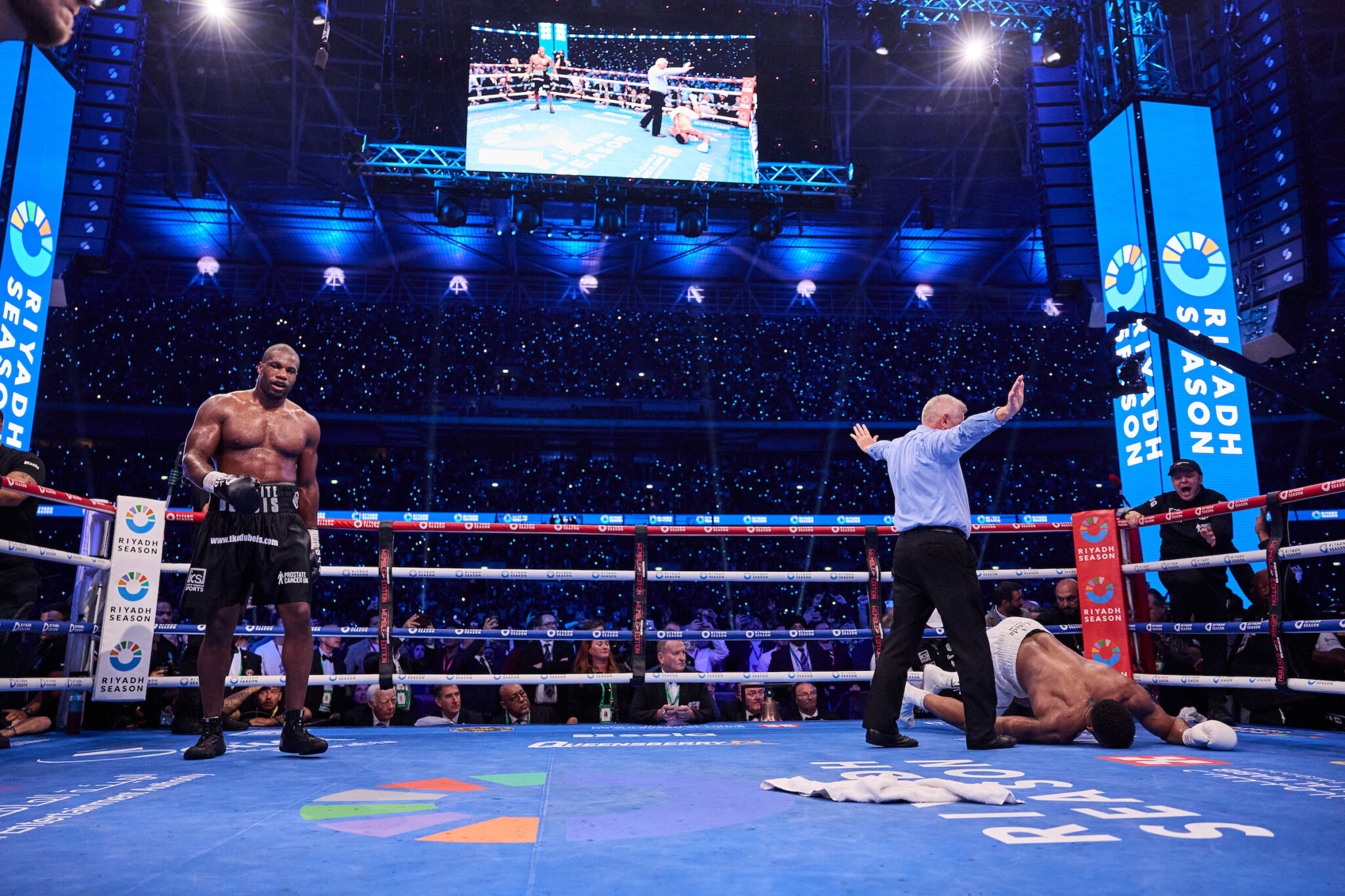 Daniel Dubois puts Anthony Joshua down in round 5 and is counted out by Referee Marcus McDonnell