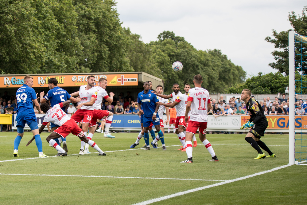 A whipped cross from the left whistled across the six-yard box and was met with a firm header from Freddie Ladapo and was astoundingly pushed away by the sprawling keeper, a moment which brought Kingsmeadow to its feet.