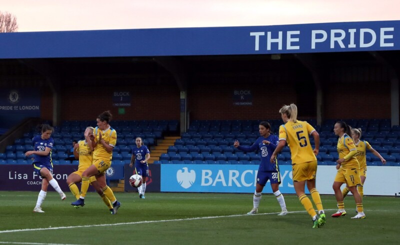 Chelsea had all the early pressure, Guro Reiten almost, followed up a Jessie Fleming byline cross, but the ball, inched wide of Grace Maloney’s goal.