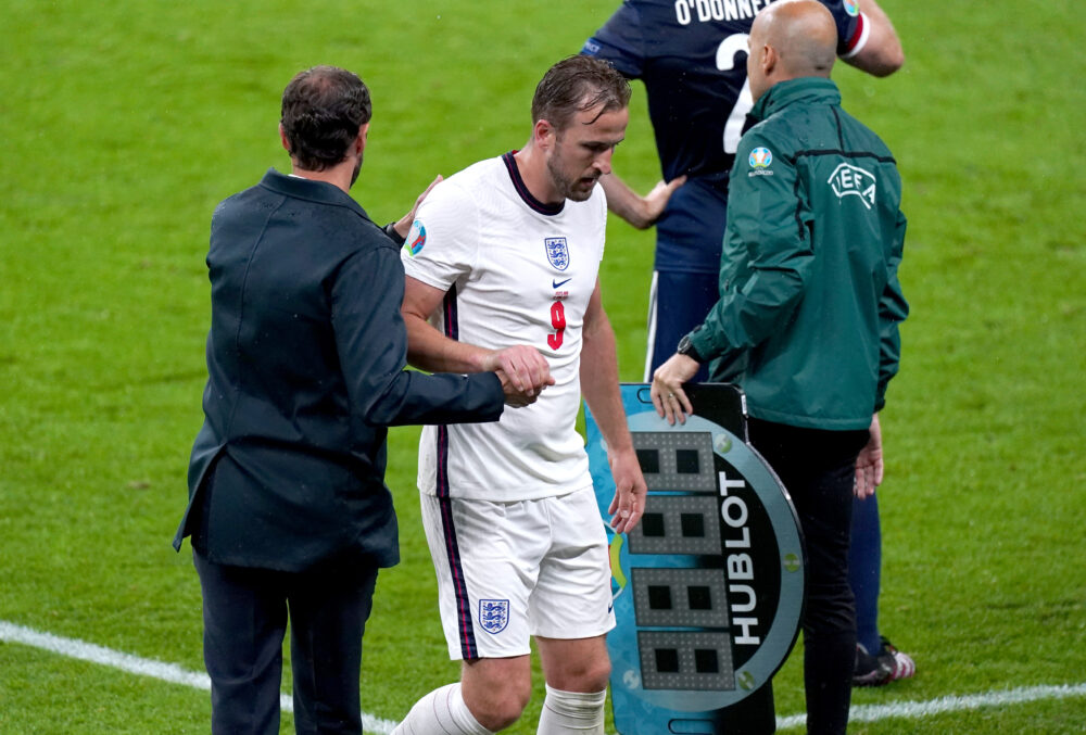 England’s Harry Kane shakes hands with manager Gareth Southgate after being substituted during the UEFA Euro 2020 Group D match at Wembley Stadium, London.