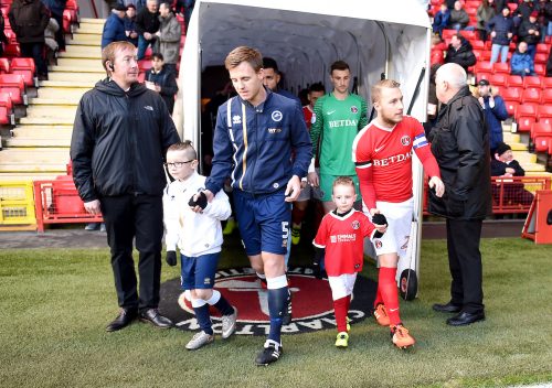 Millwall’s Tony Craig (left) and Charlton Athletic’s Chris Solly (right) walk out with mascots