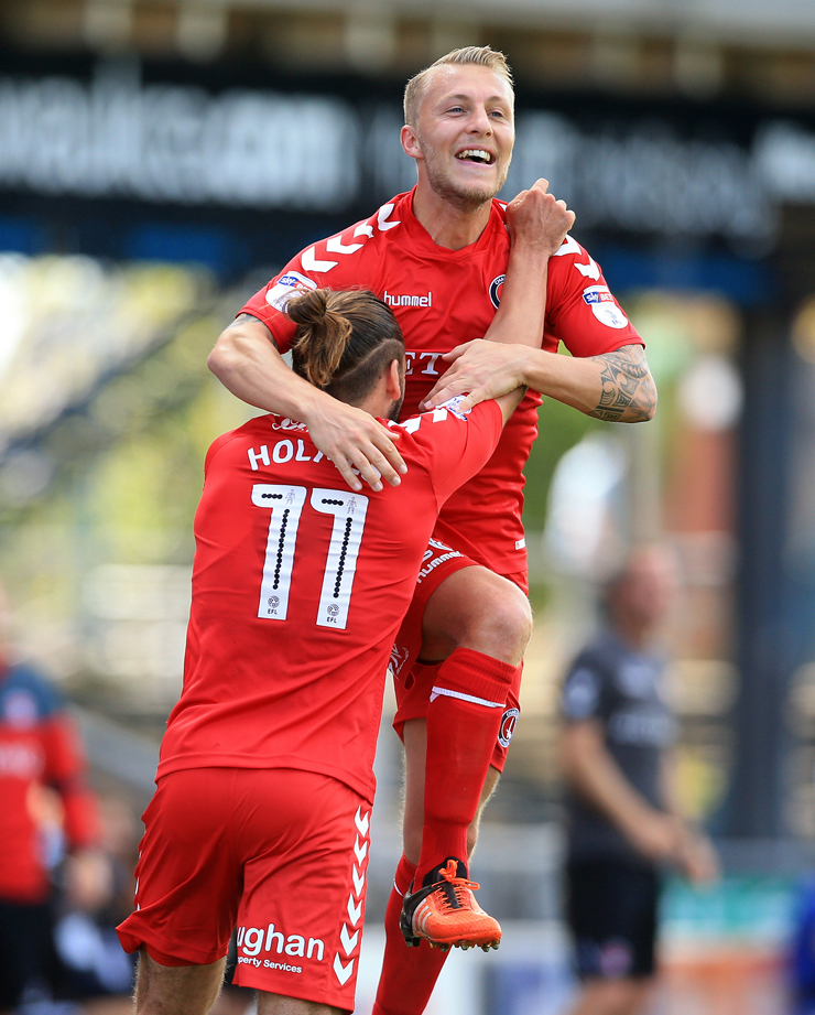 Charlton Athletic’s Ricky Holmes (No 11) celebrates with team-mate Chris Solly after he scores his sides first goal.