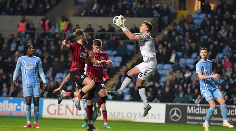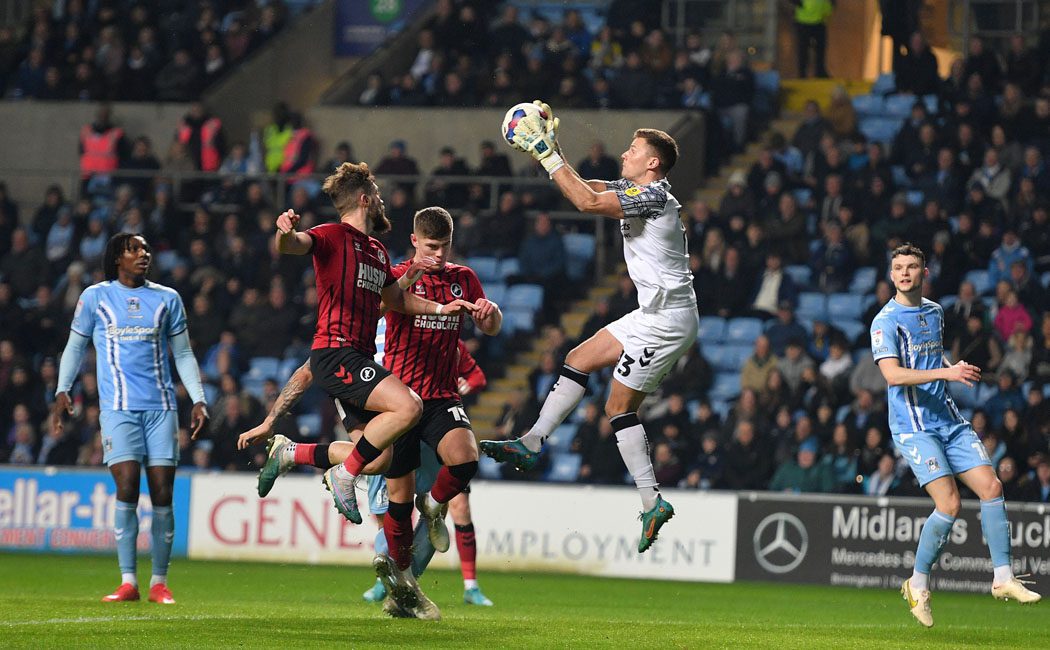 Twice George Long rushed out to save as Coventry’s number 17 rampaged through, one of those ricocheting back off of him and going narrowly the wrong side of the right upright.