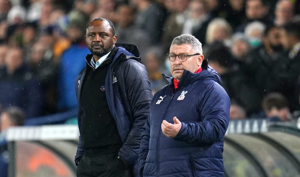 Crystal Palace manager Patrick Vieira (left) and assistant manager Austin Roberts during the Premier League match at Elland Road, Leeds.