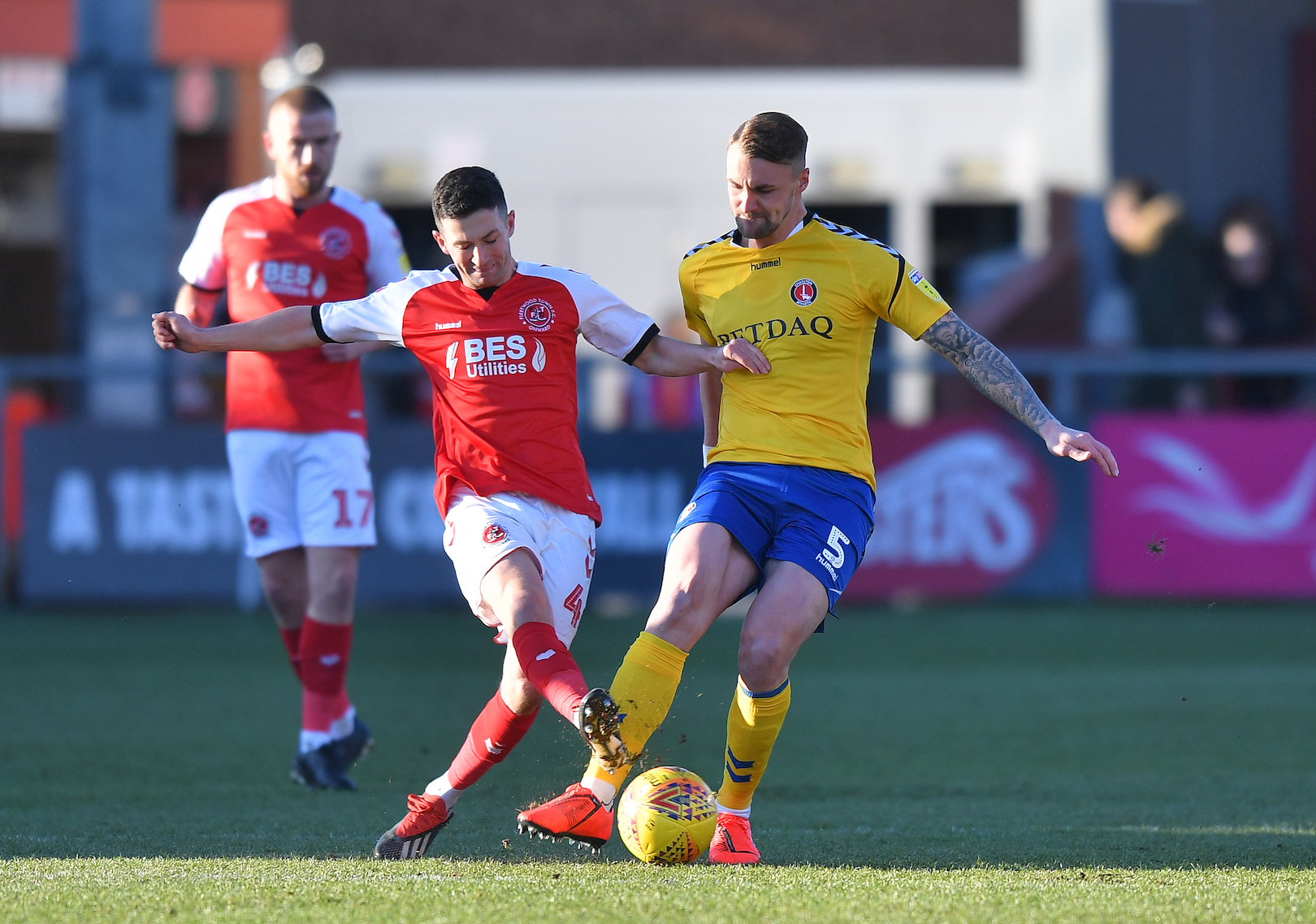 Charlton Athletic’s Patrick Bauer battles with Fleetwood Town’s Jason Holt