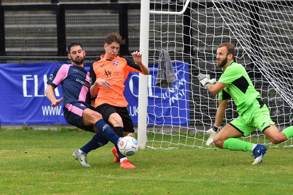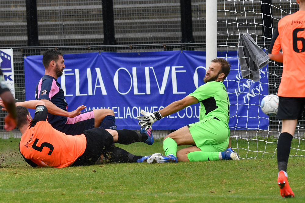 Three minutes later pandemonium broke out at the other end. Diving in to win a loose ball in the Tonbridge area there was contact between May and Folkes which prompted the latter to theatrically hurl himself to the ground. Unimpressed, referee Dean Skipper waved play on as May’s shot was charged down and Nathan Green rammed home the rebound.