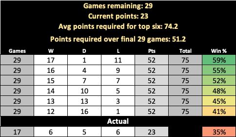 Realistically, they’ll need to win about half their remaining 29 games to hit the average points required to hit the top six. And only lose between five and seven. That’s a big ask. But back to back wins in the next two league games against Cheltenham and Cambridge at The Valley could leave things feeling different.