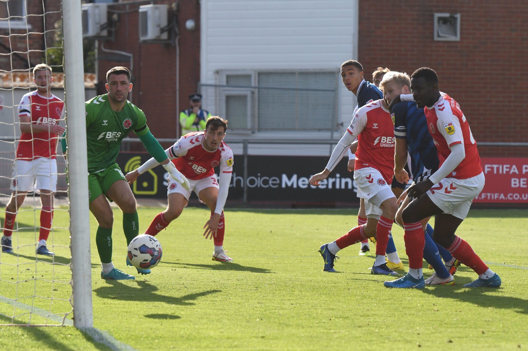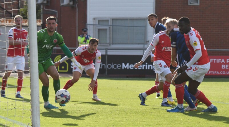 Eoghan O’Connell walks away disappointed after Fleetwood open the scoring. Kyle Andrews