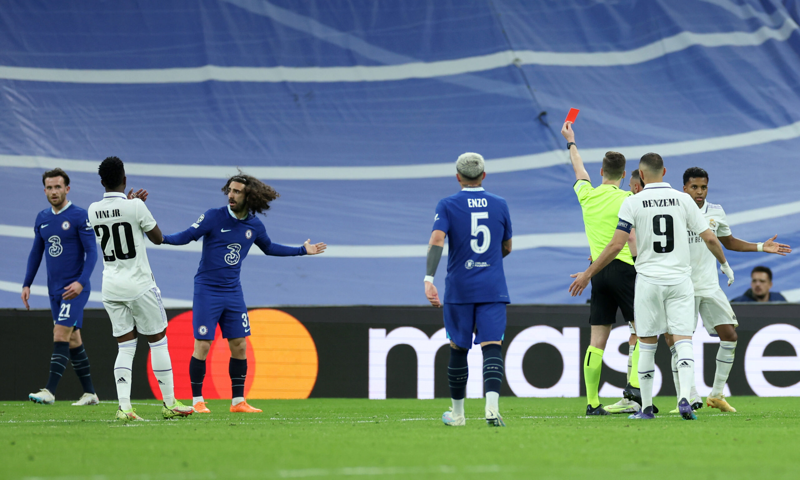 Left-back Ben Chilwell was shown a red card for pulling Rodrygo down outside the penalty area.