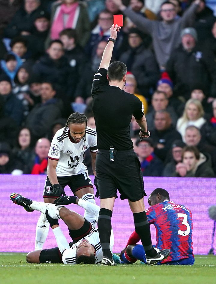 Referee Andrew Madley (centre) shows a red card to Crystal Palace’s Tyrick Mitchell (right) for serious foul play on during the Premier League match at Selhurst Park, London.