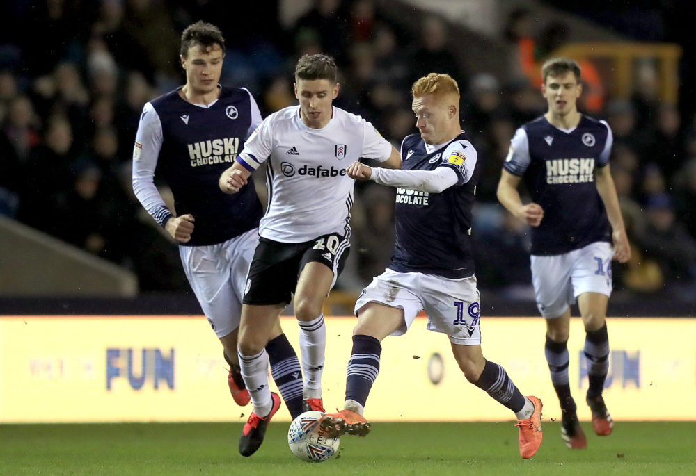 Fulham’s Tom Cairney (centre left) and Millwall’s Ryan Woods (centre right) battle for the ball during the Sky Bet Championship match at The Den, London.