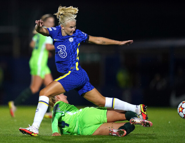 But on 12 minutes Kerr latched onto a long ball, raced clear of the stuttering Wolfsburg rearguard, before producing the composure needed and clipped the ball over Almuth Schult with the outside of her right boot and the ball nestled comfortably into the back of the net to put then Blues 1-0 up.